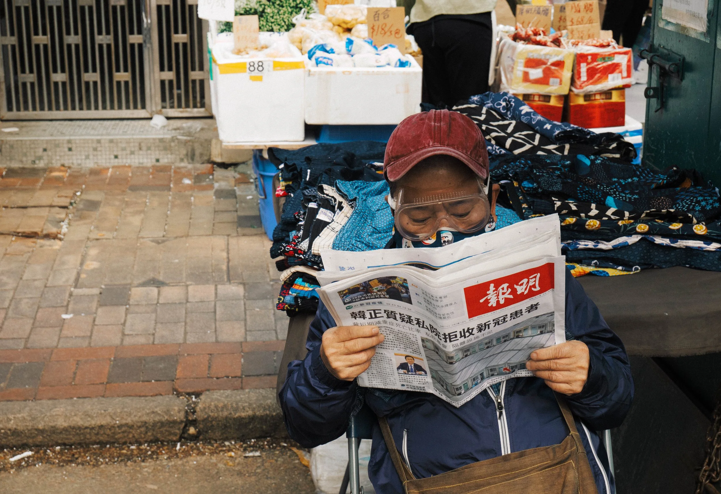 A vendor reads a newspaper reporting that hospitals are refusing to admit infected patients. Sham Shui Po.
